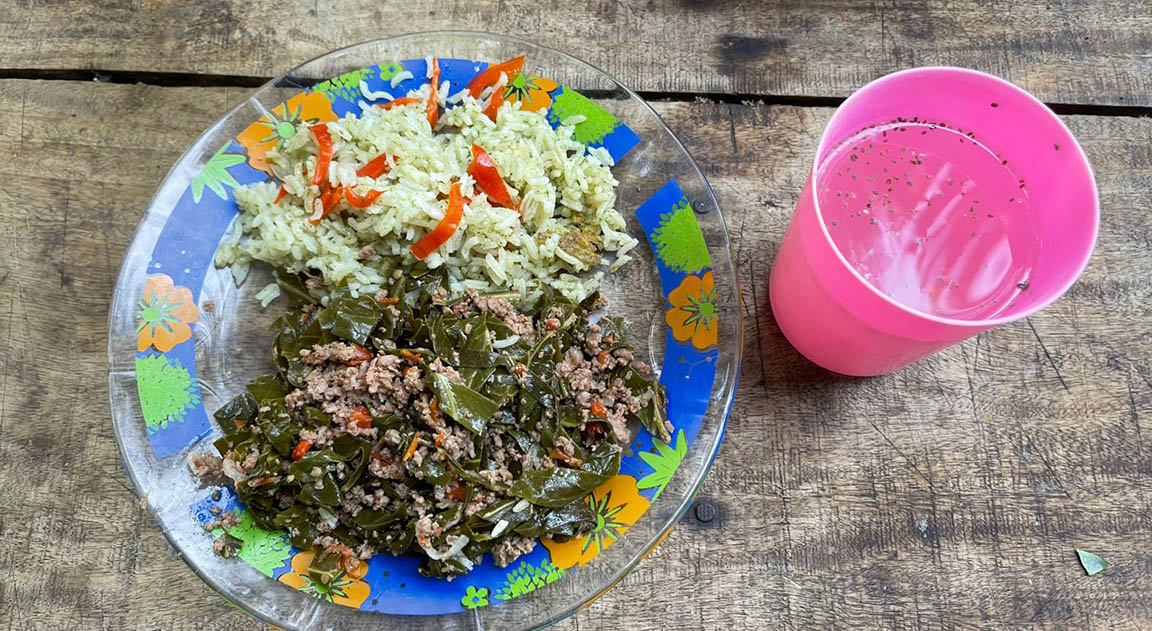 En la comunidad Luisiana, municipio de Patulul, Suchitepéquez, tres integrantes del Centro de Aprendizaje para el Desarrollo Rural (CADER), transformaron hortalizas frescas de su huerto comunitario en platillos nutritivos para la familia, como guisado de repollo con carne molida, arroz verde con hierba mora y cilantro, y refresco natural de limón con chía.