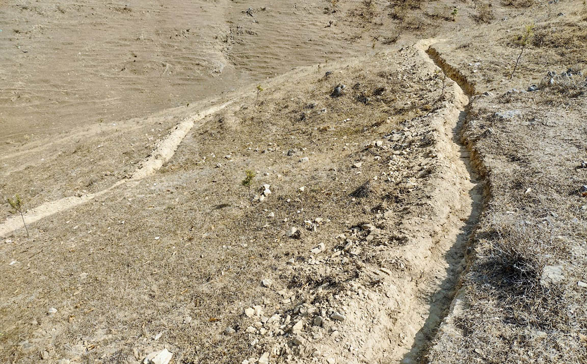 • Acequias de ladera: zanjas superficiales dispuestas perpendicularmente a la pendiente para captar y conducir el agua, evitando escorrentías intensas. Complementan la siembra en contorno.