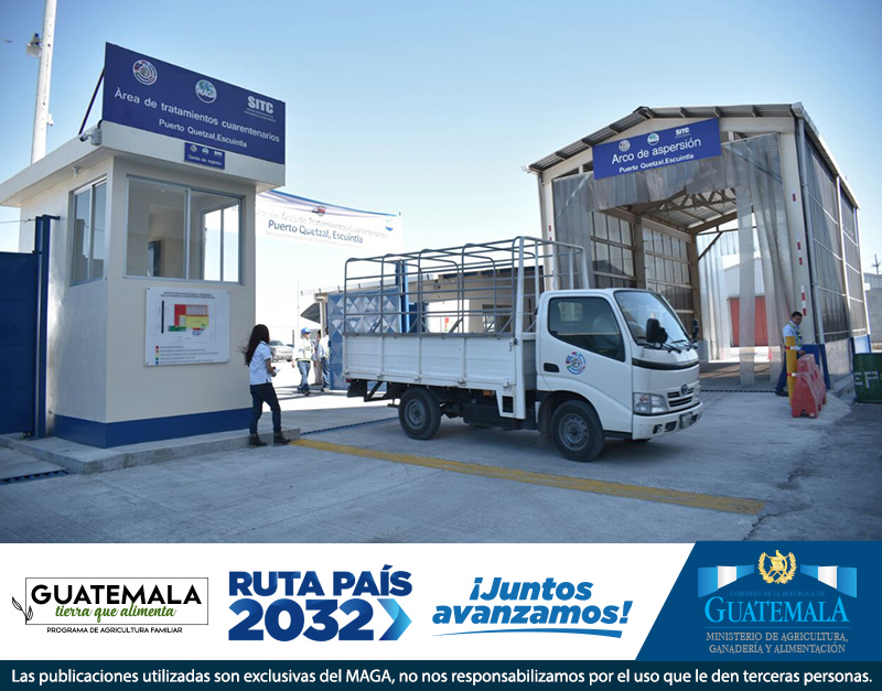 Portuaria Quetzal, uno de los principales puertos para el ingreso de productos agropecuarios ya está resguardado con nueva área de tratamientos cuarentenarios. Las nuevas instalaciones, son el resultado del trabajo conjunto del MAGA, OIRSA y Empresa Portuaria Quetzal. Cuentan con oficina de atención al usuario, área de aspersión, fumigación, exposición y ventilación, además de bodega y sistemas de seguridad para atender a 15 medios de transporte simultáneamente, todo con tecnología de primer mundo.