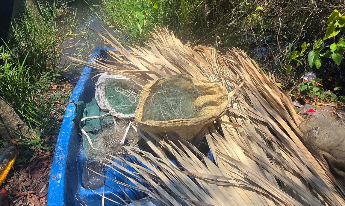 Se hicieron los patrullajes en la zona y en el recorrido por el arroyo Ixlú, se localizaron costales abandonados a la orilla del arroyo, en los que se encontraban las artes de pesca, las cuales están prohibidas y por ello se procedió al decomiso inmediato.