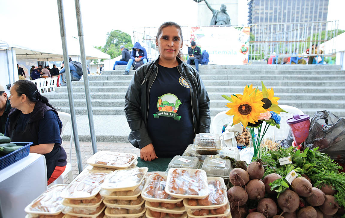 Eva Melgar, productora de hortalizas y embutidos de El Tejar, Chimaltenango, ofrece en su puesto longanizas y chorizos, junto con remolachas recién cortadas del huerto comunal de Chimaltenango. Con una sonrisa tímida, relata que ha sostenido a su familia durante décadas, gracias al trabajo entre surcos.