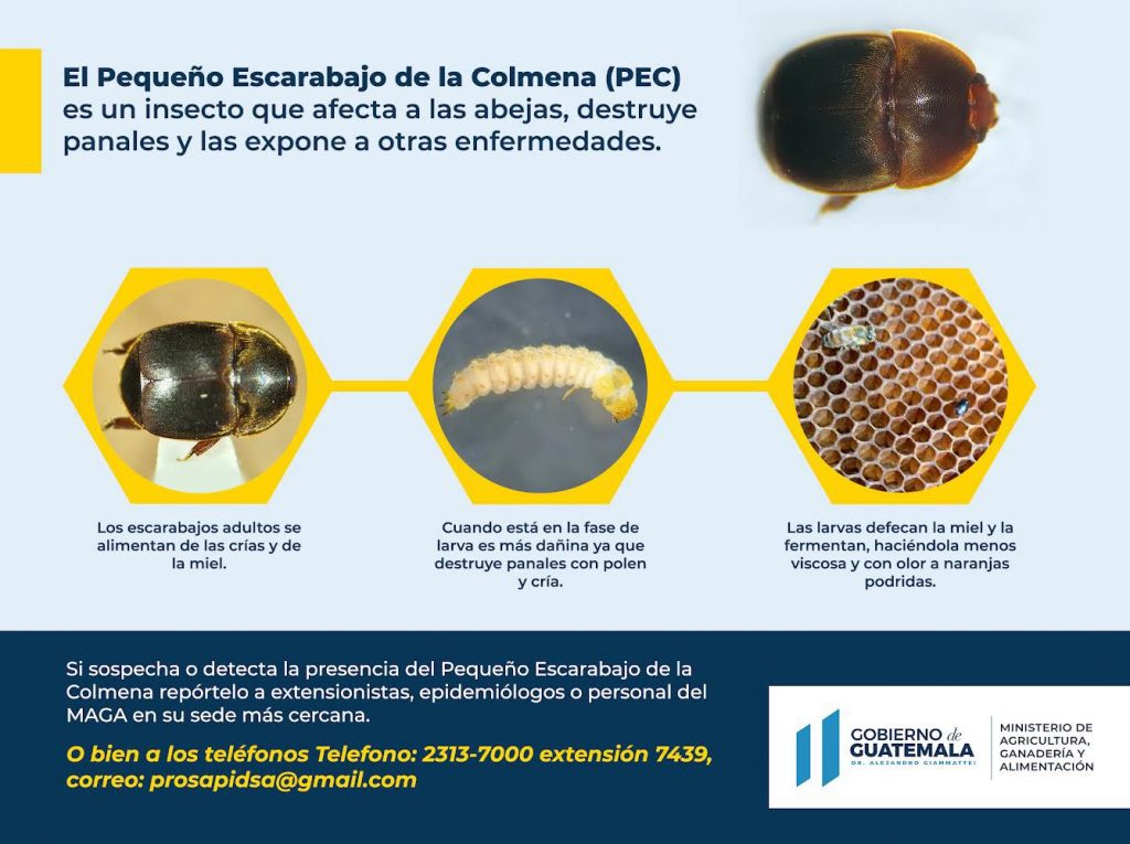 Con el fin de proteger la producción apícola en Guatemala, el Ministerio de Agricultura, Ganadería y Alimentación (MAGA) realiza monitoreos en campo para establecer y prevenir la presencia del Pequeño Escarabajo de la Colmena (PEC).