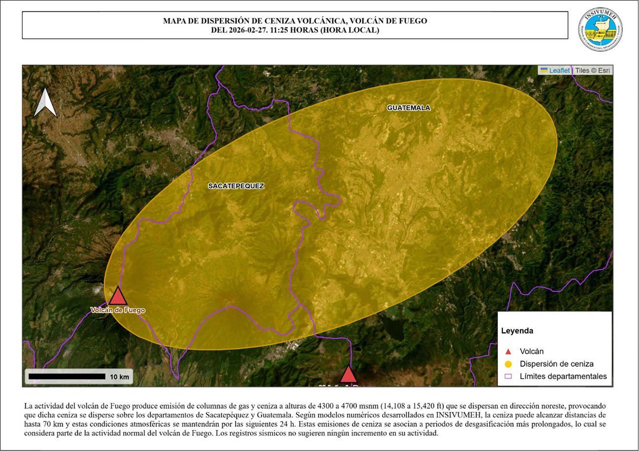 Se prevé la persistencia de la actividad volcánica, con posible caída de ceniza en los departamentos de Sacatepéquez, Guatemala y El Progreso, lo que podría afectar suelos, hojas y ganado, si no se aplican medidas preventivas.