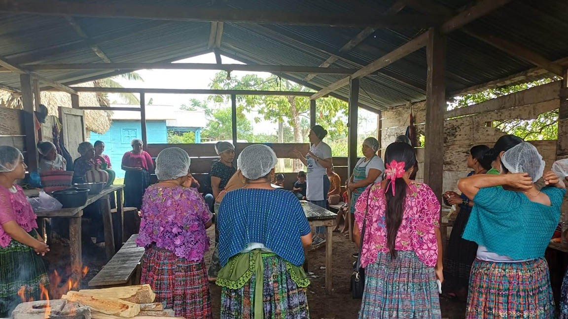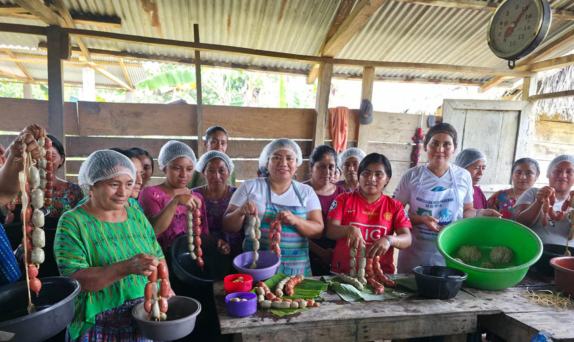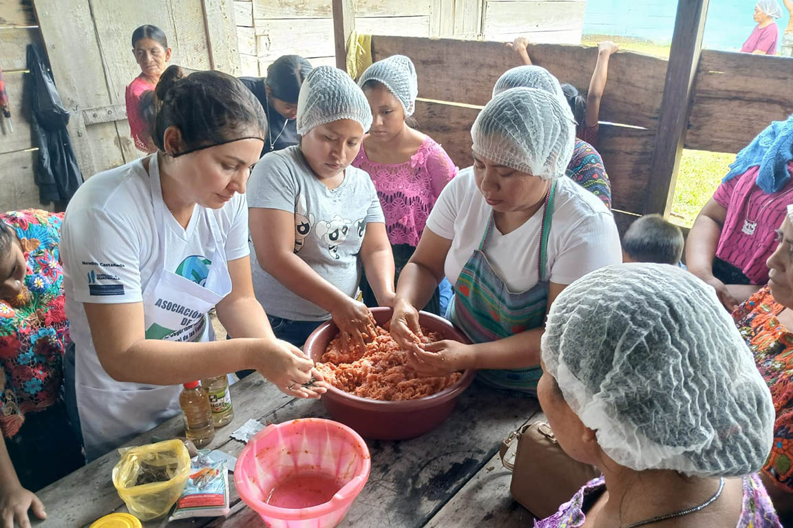 El grupo de mujeres del Centro de Aprendizaje para el Desarrollo Rural (CADER) de la comunidad Arroyo Santa Amelia, en Sayaxché, Petén, participó en una capacitación acerca de la elaboración de embutidos, específicamente chorizos y longanizas.