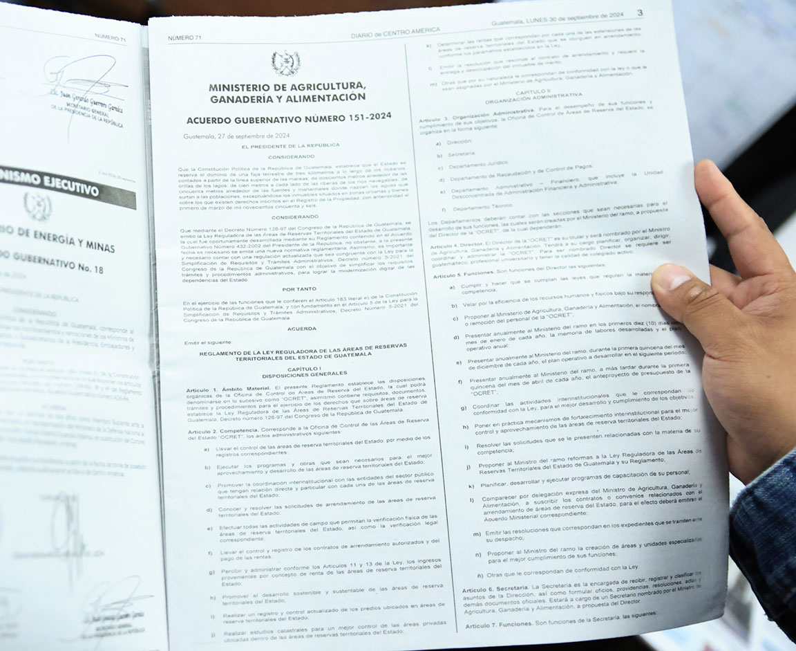 Con la emisión del reglamento de la Ley Reguladora de las Áreas de Reservas Territoriales del Estado de Guatemala, Acuerdo Gubernativo número 151-2024 que fue publicado este lunes 30 de septiembre de 2024 en el Diario Oficial, las y los usuarios de la Oficina de Control de Áreas de Reserva del Estado (OCRET) se benefician con trámites más ágiles y electrónicos.