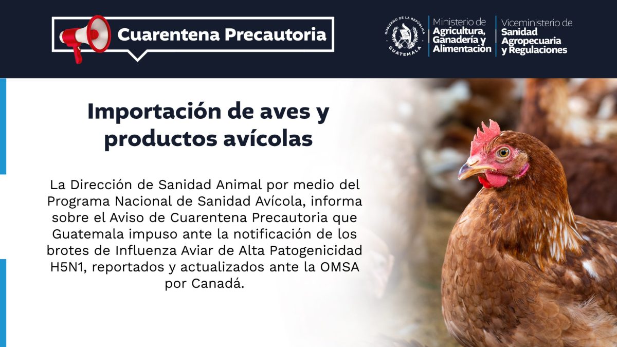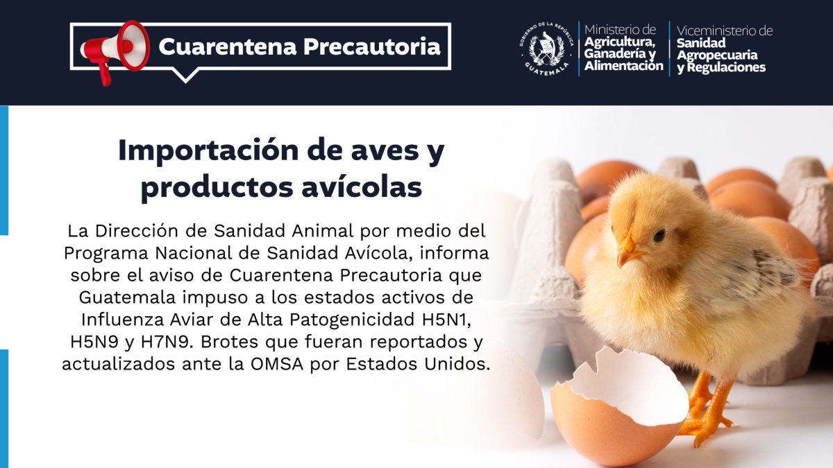VISAR en LíneaImportaciones / ExportacionesRegistros de EmbalajeEstablecimientos Autorizados FormulariosNormativa Noticias Relevantes Ver todas las notas... Emitidos 4104 certificados de registro sanitario para productos de uso veterinarios 16 diciembre, 2025 Comisión Específica del Gusano Barrenador sumará instituciones para mejor coordinación 15 diciembre, 2025 Efectúan monitoreo biológico de peces de captura en Izabal 11 diciembre, 2025 Monitoreo biológico en el lago de Atitlán para identificar especies de peces que se capturan 11 diciembre, 2025 Guatemala preside reunión de CODEGALAC en la que se revisan avances y las propuestas regionales 11 diciembre, 2025 Atención sanitaria a más de 38 mil cerdos en 2025 10 diciembre, 2025 Impulsan acciones para proteger y conservar los suelos de Guatemala 5 diciembre, 2025 Guatemala suscribe la Política de Integración de la Pesca y la Acuicultura 2026–2035 3 diciembre, 2025 Importación de animales, productos y subproductos de origen animal, vegetal e hidrobiológico. IMPORTAR Avisos Cuarentena Precautoria 5 diciembre, 2025 Cuarentena Precautoria Estados Unidos 14 octubre, 2025 Cuarentena Precautoria Estados Unidos 14 octubre, 2025 Cuarentena Precautoria Canadá 2 octubre, 2025 Aviso PRONASA 17 septiembre, 2025 Aviso PRONASA 17 septiembre, 2025 Aviso PRONASA 29 agosto, 2025 Cuarentena Precautoria Panamá 29 julio, 2025 Ver todas las cuarentenas INFÓRMATE CONSTANTEMENTE EN NUESTRAS REDES