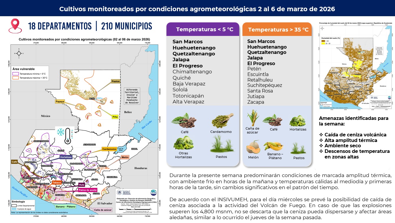 El informe, elaborado por el Centro de Información Estratégica Agropecuaria del Ministerio de Agricultura, Ganadería y Alimentación (MAGA) con base al pronóstico del Instituto Nacional de Sismología, Vulcanología, Meteorología, e Hidrología (INSIVUMEH), identificó doble incidencia de temperaturas altas y bajas en San Marcos, Huehuetenango, Quetzaltenango, Jalapa y Jutiapa.
